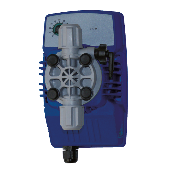 Pompa dosatrice digitale a funzionamento proporzionale alla portata, contenitore in PP caricato, IP 65, testata in PTFE con dispositivo di adescamento manuale, da collegare al contatore serie “CI4”.